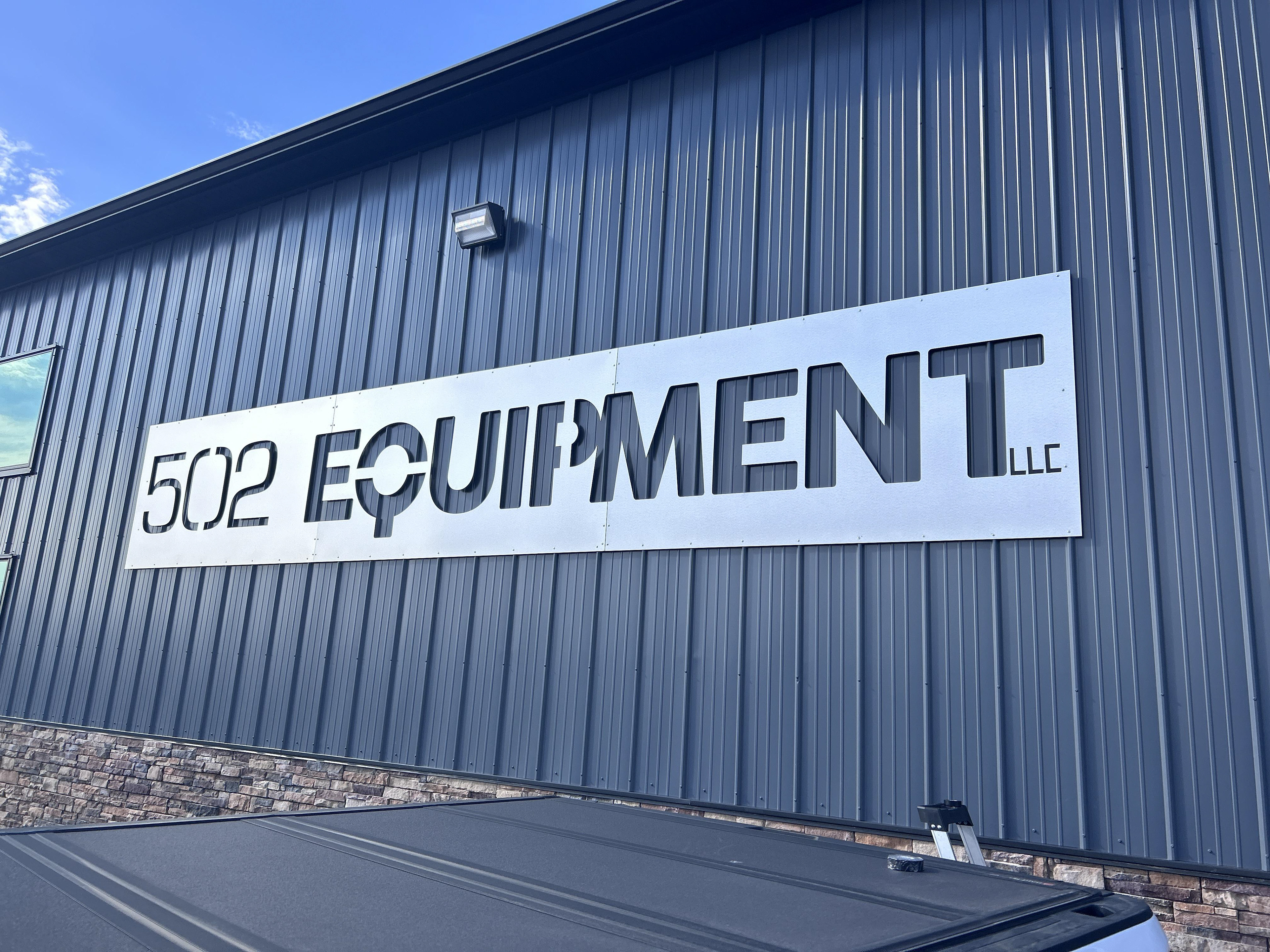 Nimlok Kentucky was asked to make exterior building signage for 502 Equipment. As the graphic designer I created large scale stencil like logo signs for the exterior of their building. These were cut out of brushed aluminum sheets and face screwed directly into the clients walls.