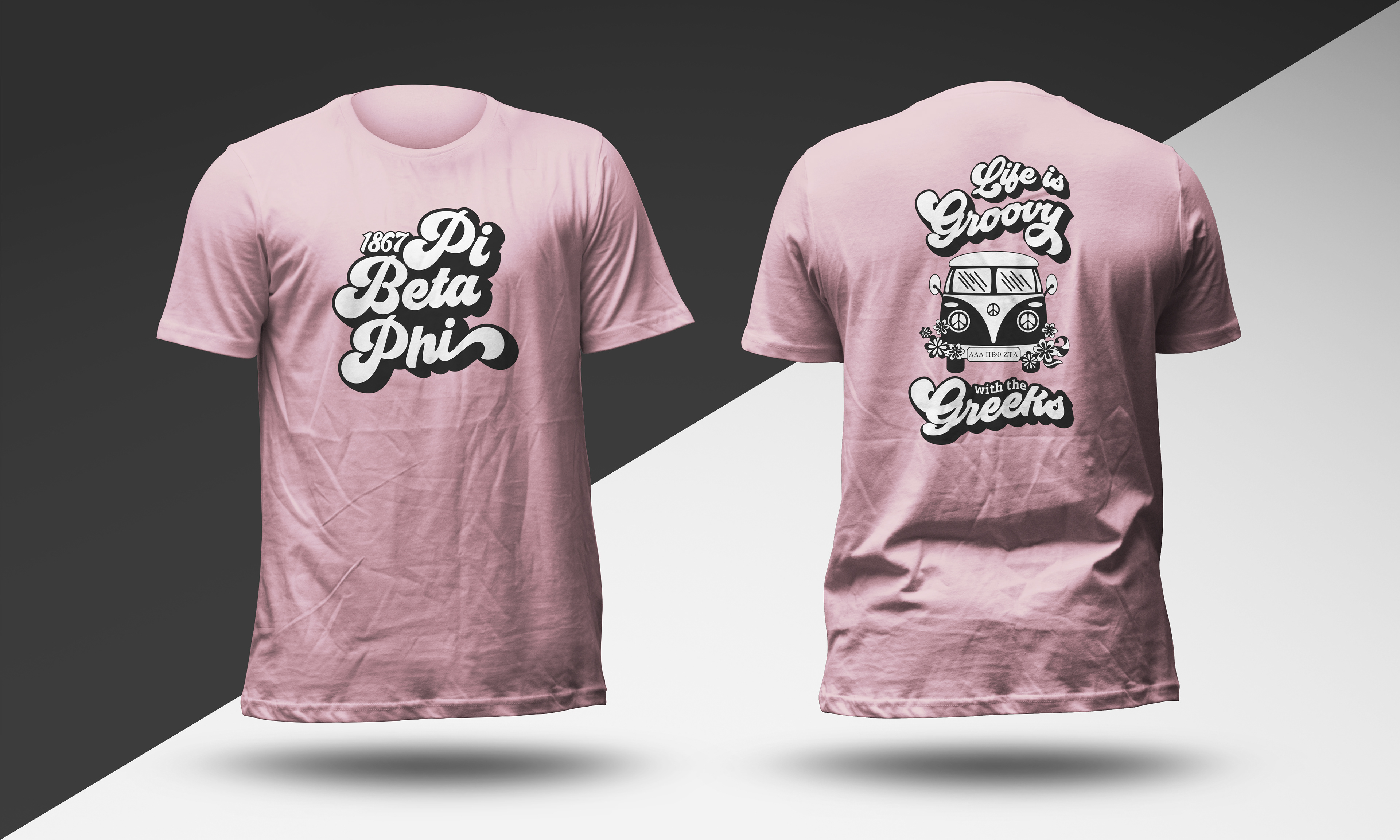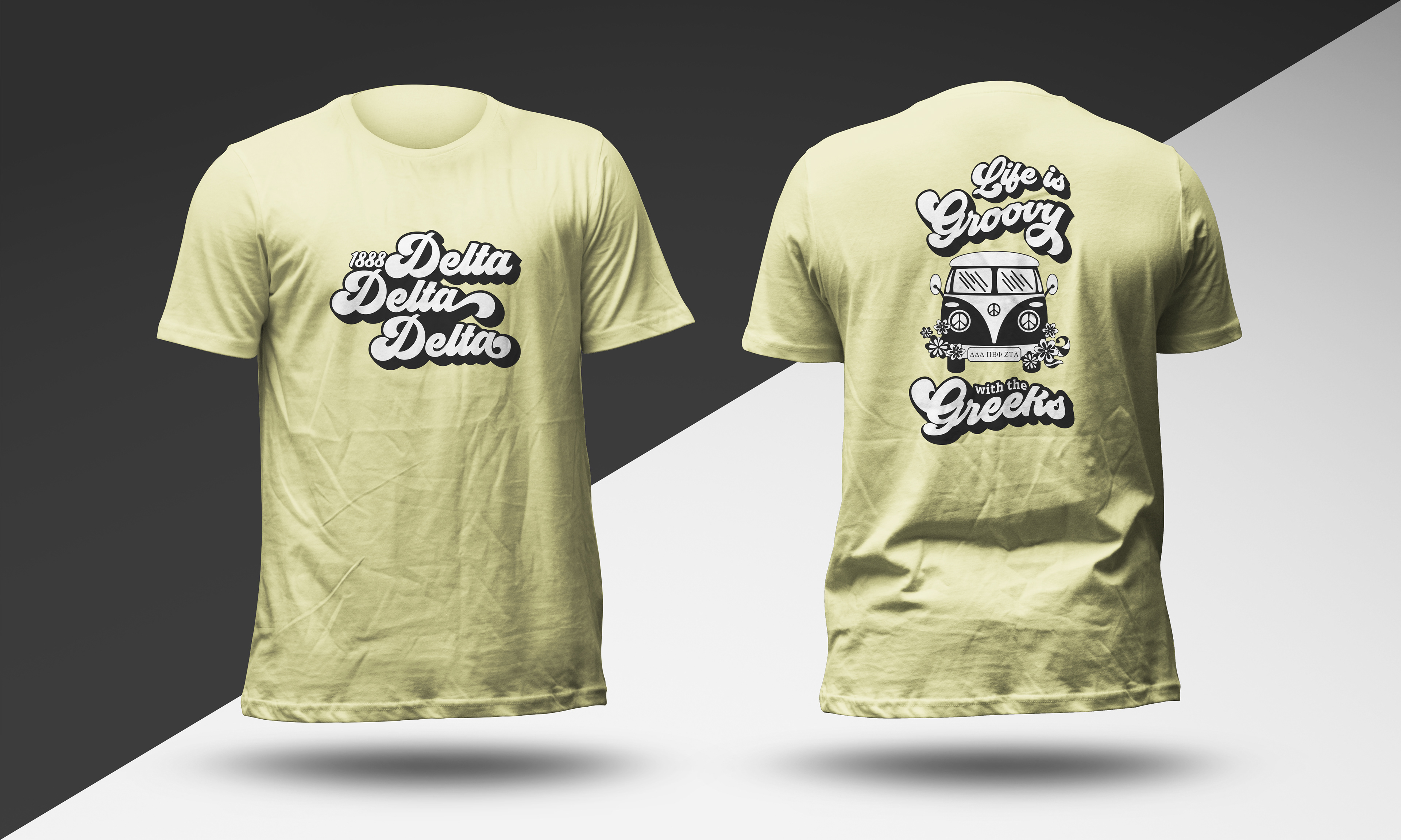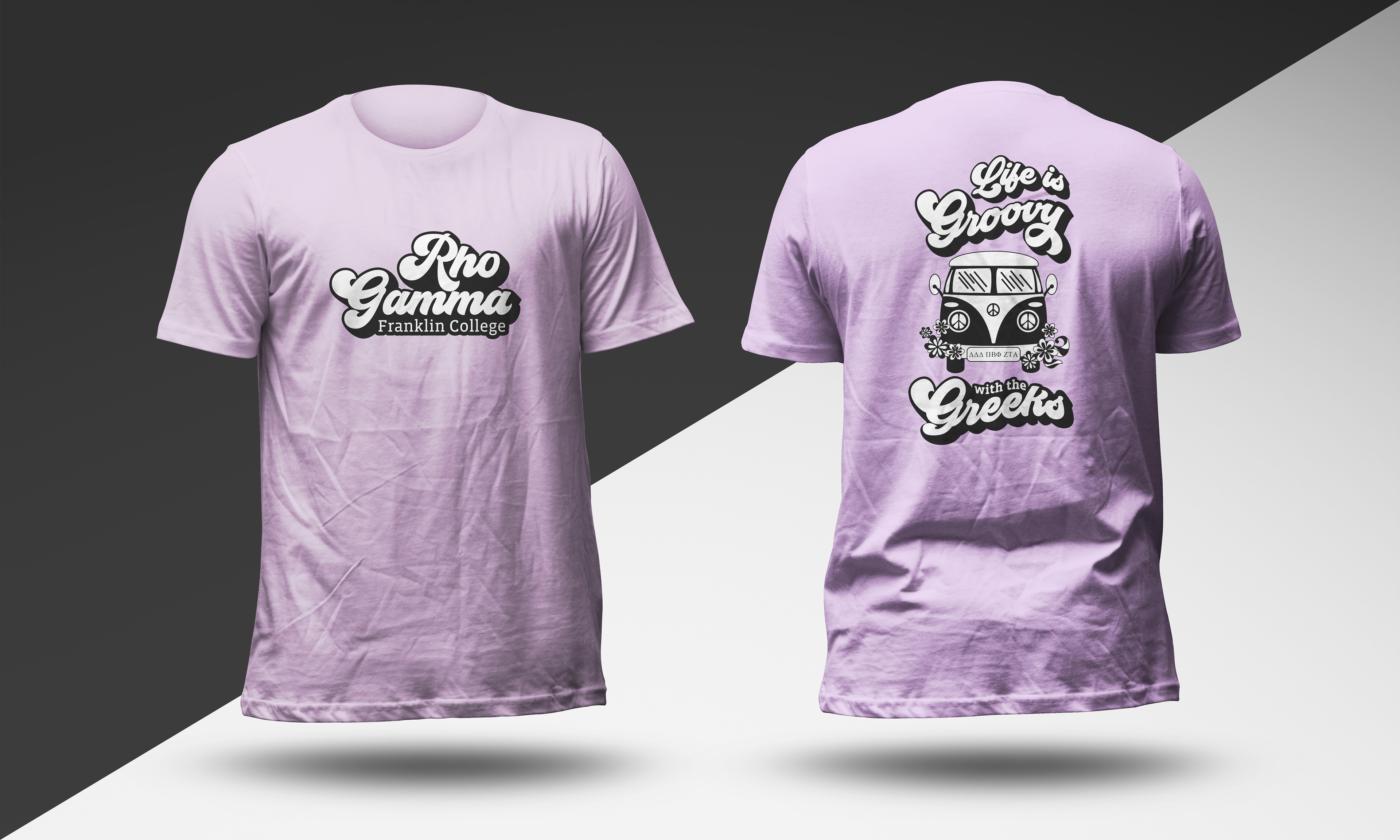 Created a generic Go Greek T-shirt and Greek house names for recruitment week at Franklin College. The backs of all shirts had the same design.
