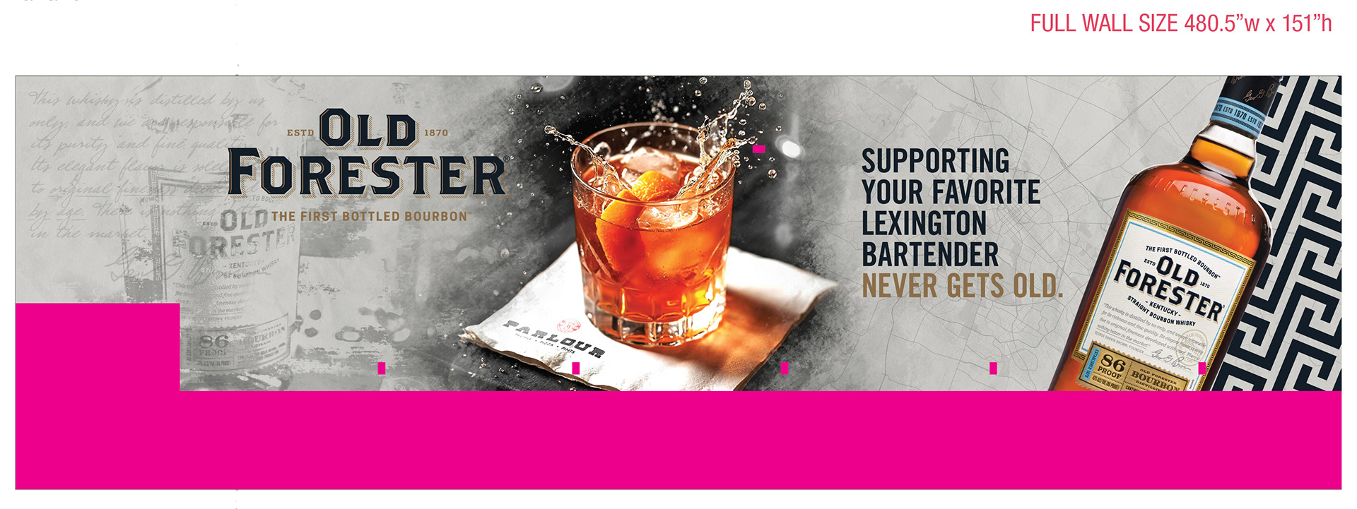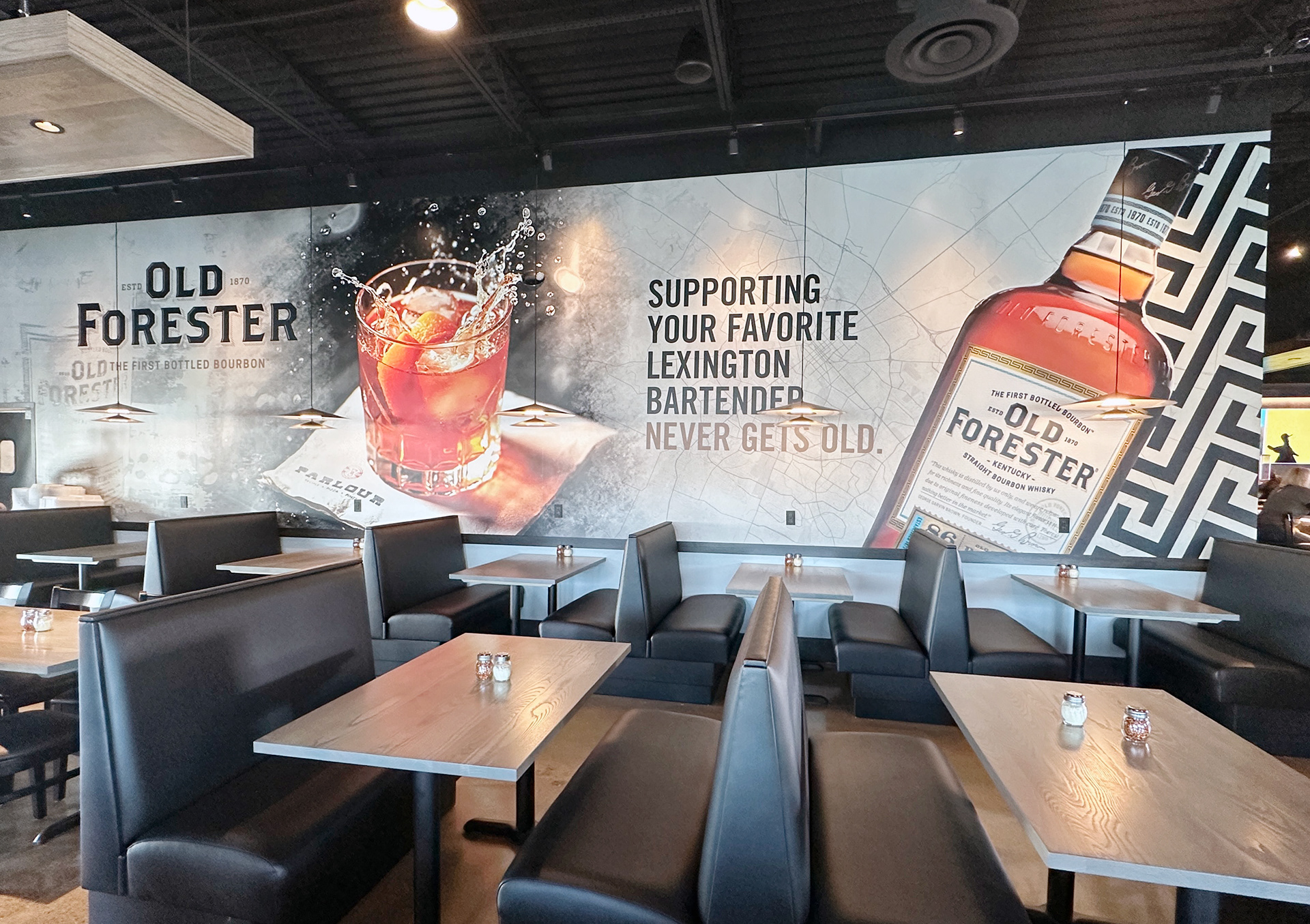 Old Forester themed wall mural for the interior wall at the grand opening of Parlour Pizza in Lexington, Kentucky. As the Graphic Designer from Nimlok Kentucky on the project, I utilized Old Forester branding and imagery to create the large scale mural.