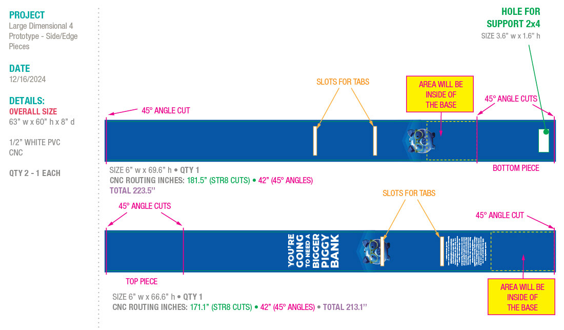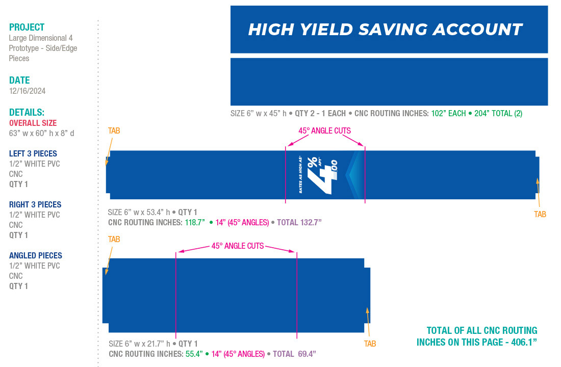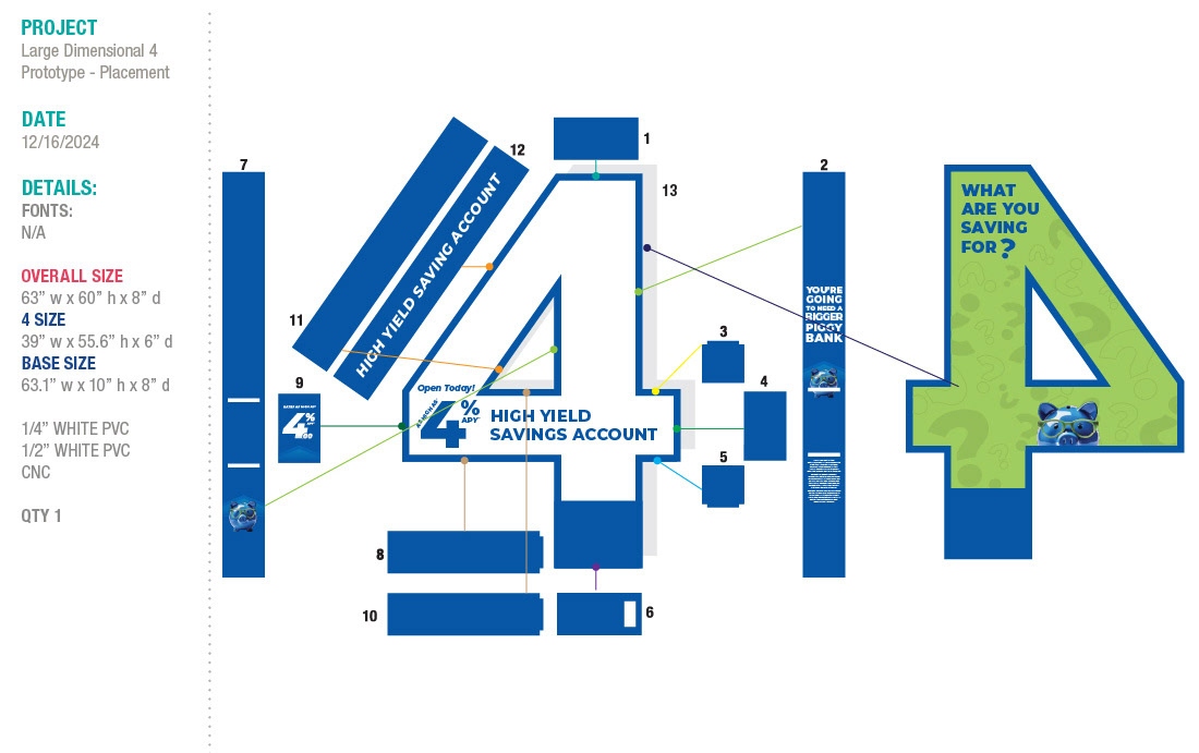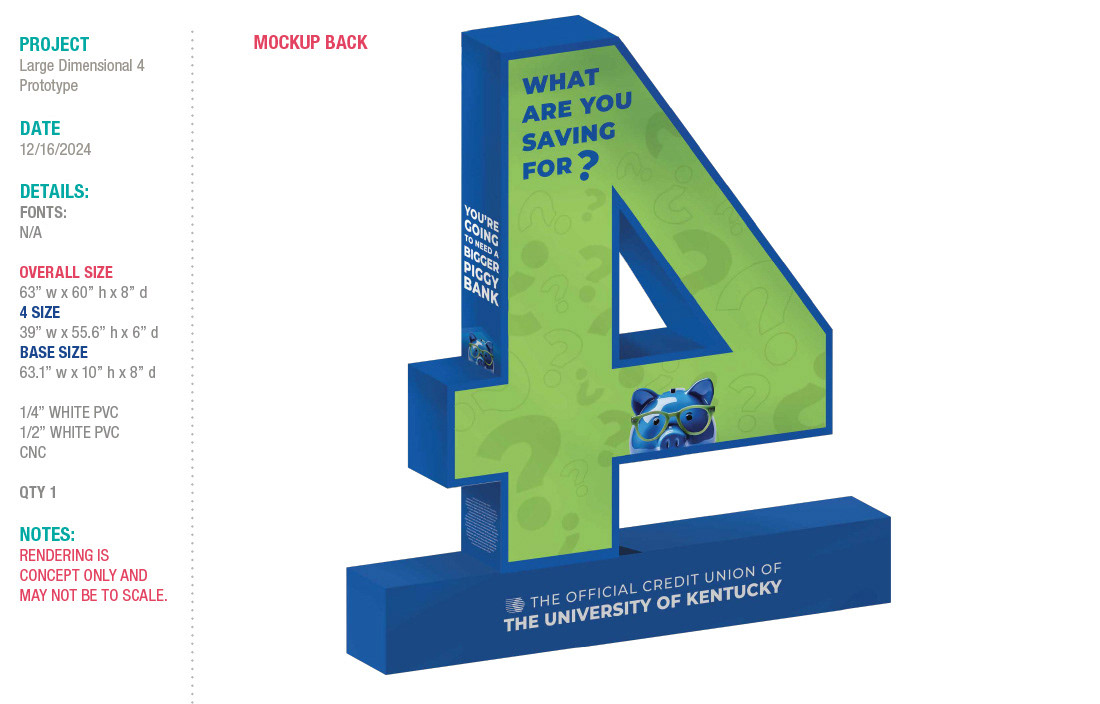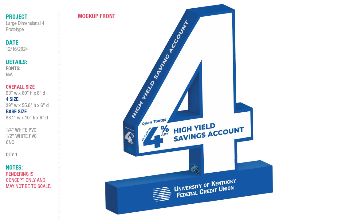 The client came to Nimlok Kentucky wanting to have a large scale 5' tall dimensional #4 made that could be placed in it's different branch locations. As the Graphic Designer on the project, I had to determine the basics of how it was going to be made so that I could create a template for artwork. The template was provided to the client for artwork to be made. Once receiving the artwork from the client I had to prepare the files for production. We ended up making a total of eight #4s.